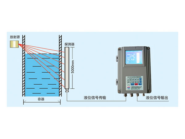 系統概述HDS-EN系列核子料位計利用能量衰減來測量料位。放射源安裝在容器的一側,棒狀探測器安裝在容器的另一側。γ射線穿過容器壁和物料上層空間到達探頭。當物料的料位增加時,到達探頭的能量減少。儀表的電子回路將這種能量的變化轉化為料位的在線檢測。利用這種技術可以獲得高精度的料位讀數和料位變化的快速反應。主要用于多種反應器﹑容器和煤倉中的液體和散狀物料的料位高度。與容器內被測物料物理、化學性質無關,特別適用高壓、強腐蝕、高粘度、結皮、高溫、高粉塵環境。 系統主要技術參數◇ 測量范圍:0-10m;若采用多線程方式,可測量數十米范圍內連續性液(料)位變化。◇ 料位測量精度:≤±3.0%滿量程◇ 時間濾波常數:0-1000s◇ 防爆等級:Exd[ia]ⅡCT6 Gb 防護等級:IP65◇ 接收探測器:采用棒狀閃爍體探測器和電離射線探測器。◇ 儀表線性化:采用對數和多點信號標正。◇ 放射源:采用Cs137或Co60,活度10-8000mCi范圍,活度大小視現場情況而定◇ γ源由特制防護罐進行屏蔽,經衛生環保部門現場檢測符合國家相關安全標準,不會對人體產生損傷,請用戶放心◇ 探測器:輸出0-5V/0-100kHz脈沖料位(液位)信號輸送二次儀表。傳輸距離可達500米。◇ 具有兩路全隔離4-20mA在線連續料位(液位)信號、全隔離4-20mA PID控制輸出。◇ 料位上下超限開關量報警。繼電器觸點容量:250VAC 5A或30VDC 5A。 系統特點:◇ 采用長壽命、高靈敏、高效率的閃爍探測器,探測靈敏,可大大減低放射源的用量,保證環境的輻射安全;◇ 非接觸的設計使在線料位測量系統非常適合在磨蝕、腐蝕、高溫、高壓的環境中應用。◇ 伽瑪輻射技術不受過程參數如壓力、溫度、粘度或密度變化的影響。◇ 高敏感的探測器可以使用小活度放射源達到高測量精度,測量的重復性是探頭量程的1.0%。◇ 采用寬工業級輸入電源模塊,滿足工業現場電源瞬變的需求,新式的穩峰技術確保儀表長期穩定的運行。◇ 采用320*240高分辨率液晶顯示,中文字幕顯示菜單,簡潔明了;在線操作提示,真正實現無紙化在線標定調試操作。◇ 儀表可在線柱狀圖形顯示容器內料位數度值變化,提供瞬時料位變化曲線查詢功能。 核子料位計、液位計工藝現場安裝示意圖